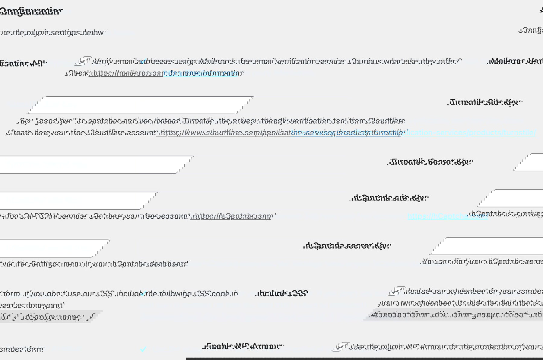If you enable external spam protection (Turnstile or hCaptcha), you'll need to configure API keys. The basic honeypot and cookie protection work without configuration.