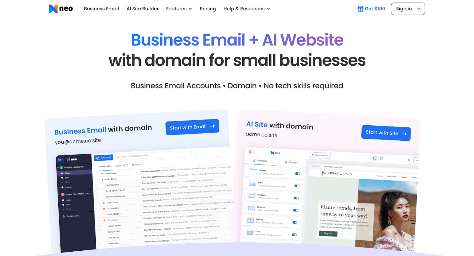 Neo is a powerful business email and growth platform designed for small businesses, freelancers, and service providers who want to look professional from day one. It gives you everything you need in one place—custom business email addresses, a free domain, a one-page website, and essential tools like email marketing, appointment scheduling, AI-assisted email writing, open-rate tracking, and follow-up reminders. With up to 100GB of storage per mailbox, mobile and web apps, signature creation, and contact groups, Neo equips you with all the tools to communicate confidently and nurture customer relationships.